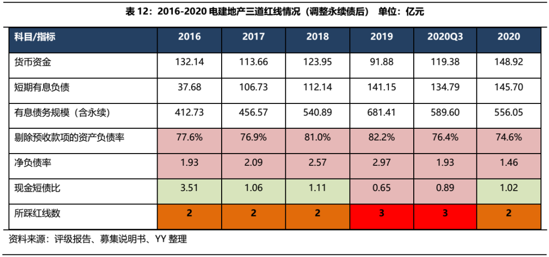 2015-2019年,電建地產(chǎn)有息債務(wù)規(guī)模持續(xù)膨脹,若將永續(xù)債納入有息負(fù)債范疇,2019年末有息債務(wù)達(dá)到681.41億元,現(xiàn)金短債比也轉(zhuǎn)紅,三條紅線均觸線,年末凈負(fù)債率為1.03,現(xiàn)金短債比為1.02,剔預(yù)負(fù)債率和凈負(fù)債率雖有所改善,但2020年底仍踩兩條紅線,現(xiàn)金短債比也在觸線邊緣徘徊,暫為橙檔企業(yè)。