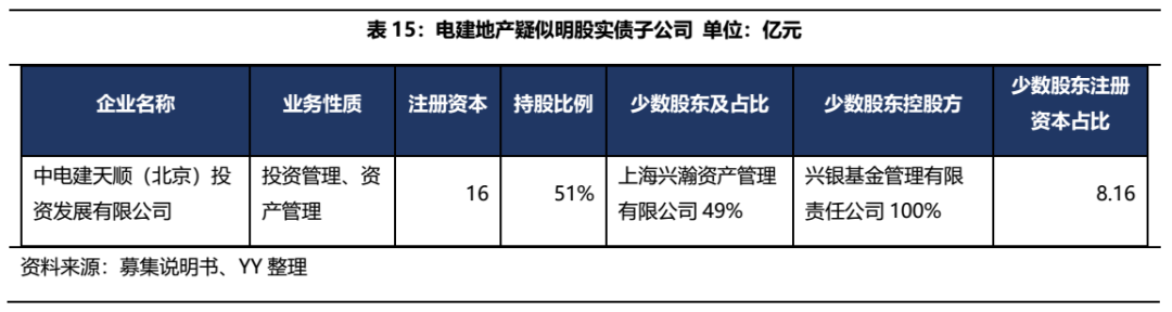 截至2020Q3,電建集團(tuán)納入合并報(bào)表范圍的一級(jí)子公司共計(jì) 49 家,其中非全資子公司 25 家,截至2020年末,南國置業(yè)納入合并子公司29家,其中非全資子公司13家,通過查找少數(shù)股東,僅發(fā)現(xiàn)中電建天順(北京)投資發(fā)展有限公司疑似存在明股實(shí)債,少數(shù)股東控股方為興銀基金,少數(shù)股東注冊(cè)資本為8.16億元。