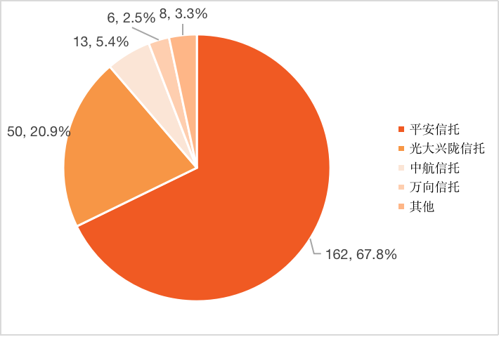 智慧芽數(shù)據(jù)顯示,截至2021年11月底,國內(nèi)有12家信托公司公開披露了239件專利。其中,平安信托專利申請量多達(dá)162件,占整個信托行業(yè)的67.8%;其次是光大興隴信托和中航信托,專利申請量分別為50件和13件。