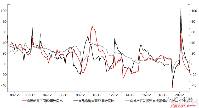 7)房地產下滑趨勢進一步惡化。新開工面積累計同比下滑17.5%,較上月跌幅12.2%進一步擴大;銷售面積累計同比下跌13.8%,前值下跌9.6%;投資完成額累計同比下跌0.7%,前值增長3.7%。三項數據均連續下滑12個月,接近2020年疫情最低值。
