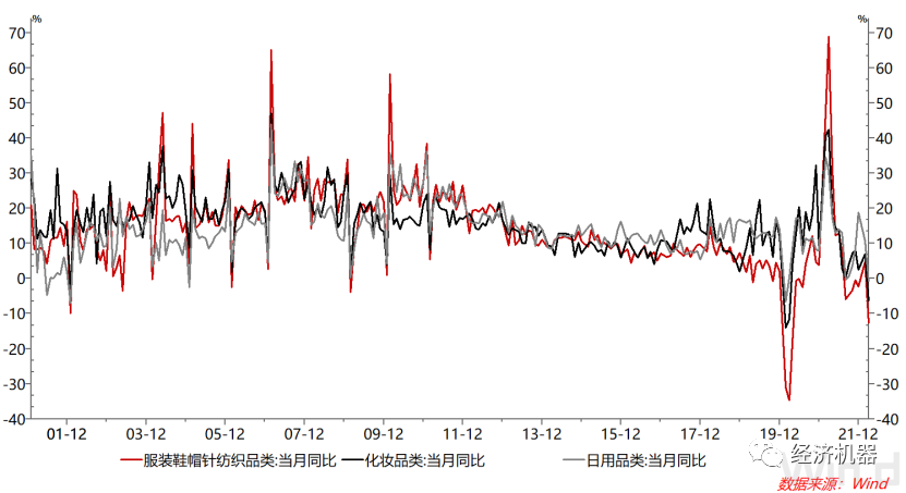 必選消費分項也繼續回落。服裝鞋帽類同比下滑12.7%,前值增長4.8%;化妝品類同比下滑6.3%,前值增長7%;日用品下滑0.8%,前值增長10.7%。