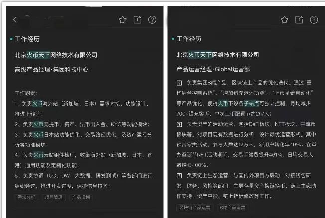 在目前Boss直聘求職者中多名北京火幣天下網(wǎng)絡(luò)科技有限公司員工明確標(biāo)注了自身在Huobi global運(yùn)營(yíng)部、集團(tuán)科技中心、法務(wù)部、開放平臺(tái)事業(yè)部、火信事業(yè)部、用戶研究中心等部門的工作經(jīng)歷,職務(wù)包括法務(wù)BP、產(chǎn)品經(jīng)理、運(yùn)營(yíng)經(jīng)理、工程師不等,工作時(shí)限大多為2018年至今,且近期在招聘平臺(tái)上較為活躍。