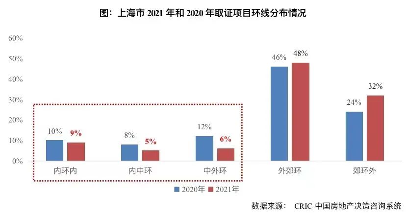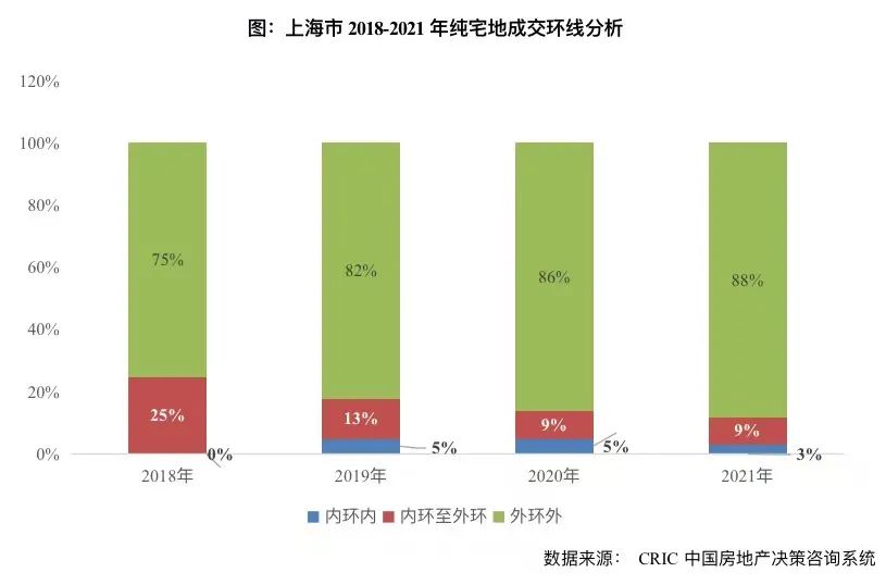 究其根本,新增供應短缺的背后實則是外環內宅地供應稀缺,從2018-2021年純宅地成交環線來看,仍以外環外為主,占比逐年遞增,已近9成,外環內累計占比則逐年回落,2021年僅為12%,而內環內市中心純宅地更是稀缺,2021年占比僅為3%。由此不難推斷,2022年上海市區單價10萬元/平以上新盤仍將延續此前的供不應求,“一房難求”的高熱成交情況短期還是難以緩解。