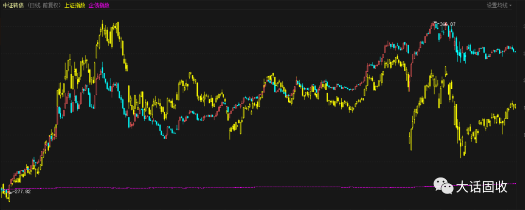 下圖是2019年至今,中證轉(zhuǎn)債指、上證指數(shù)和企債指數(shù)的走勢圖對比,顯而易見,轉(zhuǎn)債與股市的走勢高度吻合。