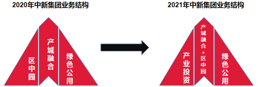 2019年中新集團(tuán)成功上市后,公司開(kāi)始改變業(yè)務(wù)結(jié)構(gòu),提高公司核心競(jìng)爭(zhēng)力。2021年中新集團(tuán)將原兩翼板塊之一的區(qū)中園業(yè)務(wù)納入主體板塊范疇;將產(chǎn)業(yè)投資從園區(qū)開(kāi)發(fā)運(yùn)營(yíng)的一個(gè)業(yè)務(wù)節(jié)點(diǎn)提檔升級(jí)為兩翼支撐板塊的重要一翼,形成產(chǎn)城融合、區(qū)中園為主體、以產(chǎn)業(yè)投資和綠色公用為兩翼支撐板塊的新發(fā)展格局。