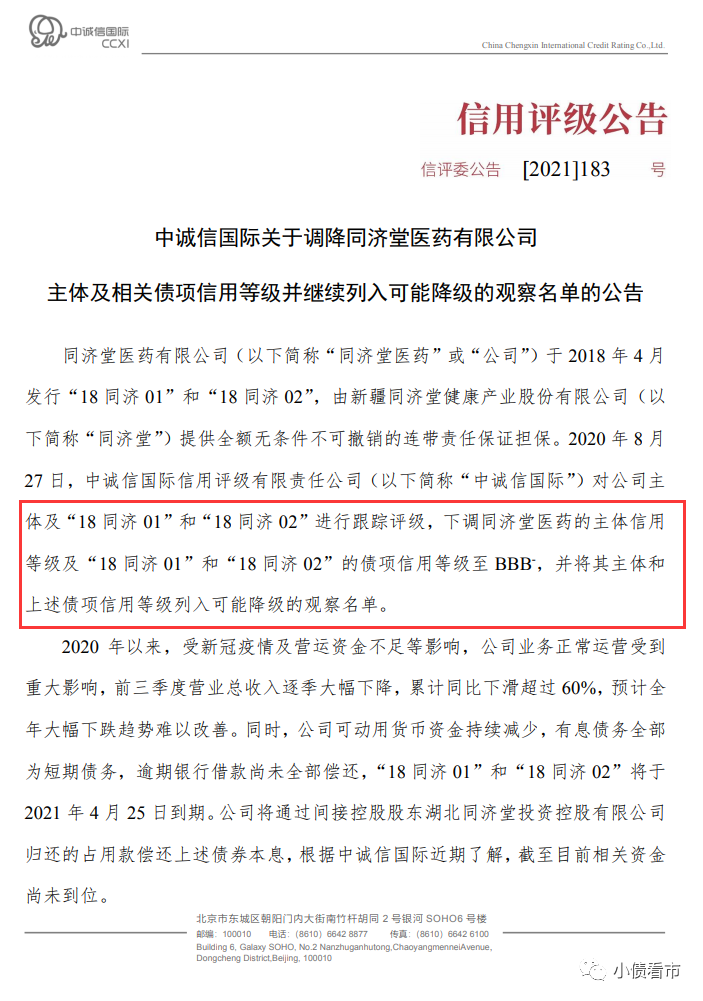中誠信國際認為,同濟堂醫藥經營業績大幅下滑、貨幣資金持續減少、以及“18同濟01”和“18同濟02”臨近到期日但償債資金尚未到位等情況令其短期償債壓力和流動性壓力加大,償債能力進一步弱化。