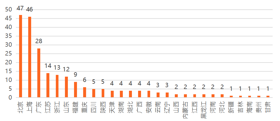 牌照業務范圍為全國的機構有44家,廣東最多為12家,北京和上海各10家;牌照業務范圍僅為部分地區的有13家,上海5家,北京3家,廣東2家,海南、山東、四川各1家。