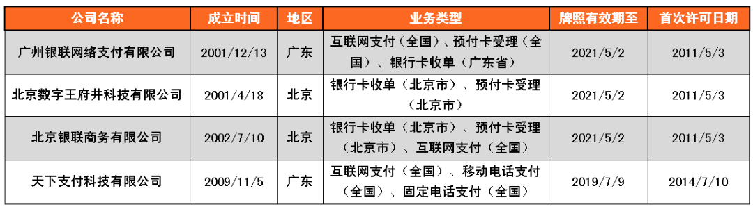 2021年5月13日,央行官網公布首批27張支付牌照續展結果,支付寶、財付通、銀聯商務、資和信、銀盛支付、通聯支付等24家支付機構全部通過續展。廣州銀聯網絡支付有限公司、北京數字王府井科技有限公司、北京銀聯商務有限公司擬與其控股股東銀聯商務股份有限公司開展整合工作,向人民銀行提交了中止續展審查申請,在中止審查期間繼續開展業務。
