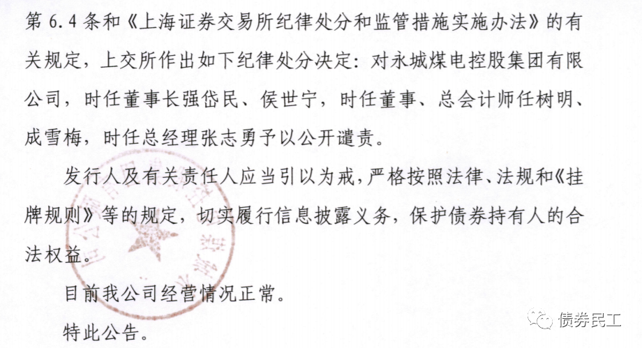 2020年11月10日,永煤集團電發行的“20永煤SCP003”意外違約,在信用債券市場上引發了極大的關注。永煤集團及相關中介機構相繼收到了監管機構的處分。在上海證券交易所的此次紀律處分之前的2021年1月14日,交易商協會對永煤集團予以公開譴責,暫停其債務融資工具相關業務1年。
