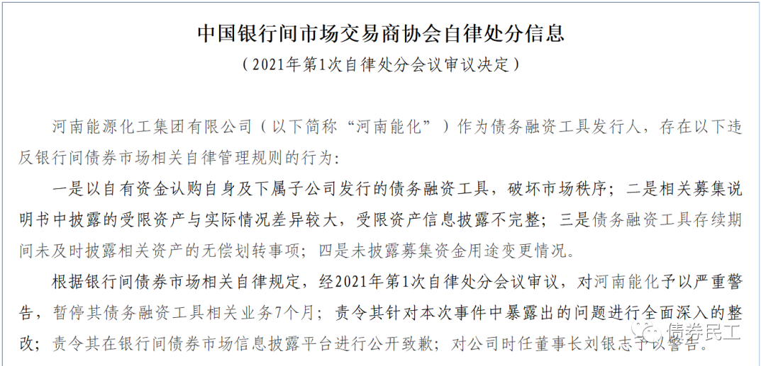 永煤集團的控股股東河南能源化工集團有限公司被交易商協會予以嚴重警告,暫停債務融資工具相關業務7個月。