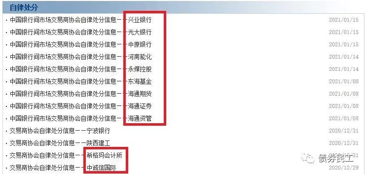 永煤集團債券違約之后,不止讓永煤集團和河南能化被交易商協會的嚴厲處分,引發了交易商協會對1家會計師事務所(希格瑪會計師事務所)、1家評級機構(中誠信評級)、7家金融機構(海通證券、海通期貨、海通證券資管、東海基金、興業銀行、光大銀行、中原銀行)的自律處分。這么大的自律處分力度在信用債券歷史上絕無僅有,康美藥業和康得新等影響較大的違約發行人也沒有這個待遇。打開交易商協會的自律處分頁面,直接被永煤事件的相關機構自律處分情況刷屏。