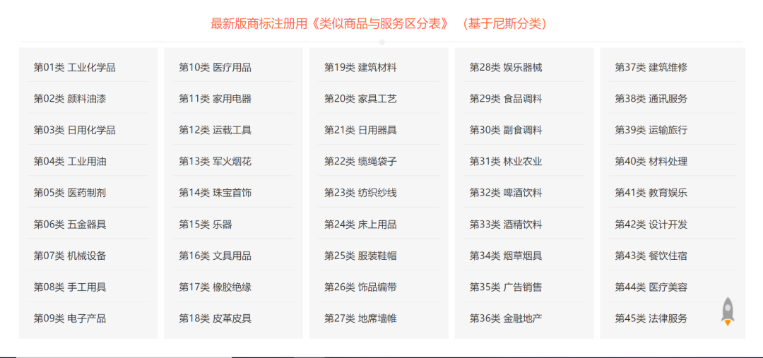 商標注冊申請前要對商品類別進行選擇,對于商品類別,我國基于尼斯商品分類制定了《類似商品和服務區分表》,將所有商品及服務共劃分為45個類別,其中:1-34是商品類別,35-45是服務類別,包含上萬個商品及服務。