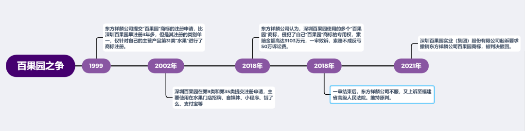 百果園作為水果品牌在市場上享有很高的知名度,但少有人知的是擁有“百果園”商標的公司其實有兩家,一家是深圳百果園實業發展有限公司,一家是東方祥麟蘋果基地有限公司。兩家公司的不同之處在于,期擁有的是不同商品類別的“百果園”注冊商標,我們常見的百果園旗艦店,一般屬于深圳百果園實業發展有限公司,而東方祥麟公司旗下的“百果園”品牌知名度并沒有那么高,但出人意料的是,東方祥麟公司反而比深圳百果園公司更早注冊“百果園”商標。這一事件被大眾了解還源于去年的近億元索賠案件。兩家公司都擁有“百果園”商標,但注冊類別不同,引發了商標糾紛。