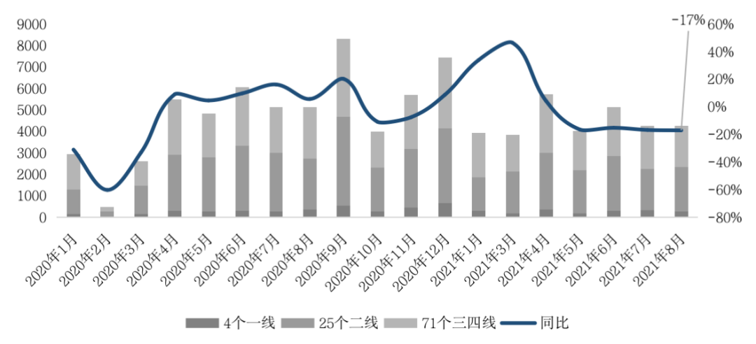圖:2020年1月-2021年8月全國(guó)100個(gè)重點(diǎn)城市商品住宅供應(yīng)面積(單位:萬(wàn)平方米)