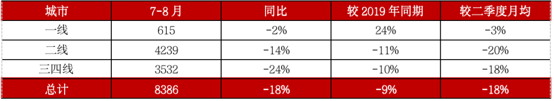 7-8月,全國(guó)100個(gè)重點(diǎn)城市商品住宅成交面積8386萬(wàn)平方米,較2020年和2019年同期分別下降18%和9%,月均成交面積相較二季度下降18%。其中,三四線下行加劇,24%的跌幅超百城平均。二線城市中,輪動(dòng)與分化現(xiàn)象在三季度愈發(fā)凸顯,此前沿海高熱城市受政策調(diào)控作用明顯降溫,小部分區(qū)域中心城市則初見(jiàn)翹尾行情。