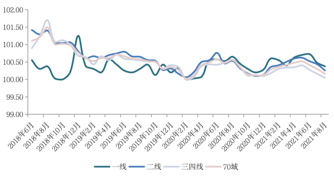 圖:2018年6月至2021年8月70個(gè)大中城市房?jī)r(jià)指數(shù)環(huán)比變化