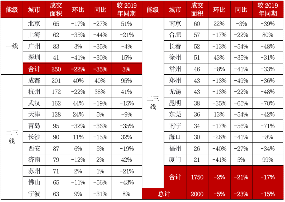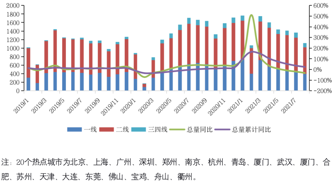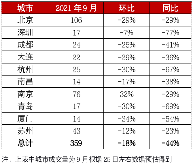 9月,28個(gè)重點(diǎn)城市預(yù)計(jì)成交面積約2000萬(wàn)平方米,“金九”銷售表現(xiàn)冷淡收?qǐng)觯h(huán)比齊跌,環(huán)比降5%,較2020年和2019年同期分別降23%和15%。