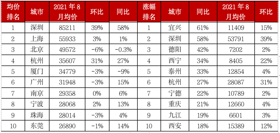 表:2021年8月105個(gè)典型城市商品住宅成交均價(jià)和價(jià)格漲幅TOP10(單位:元/平方米)