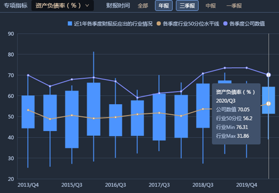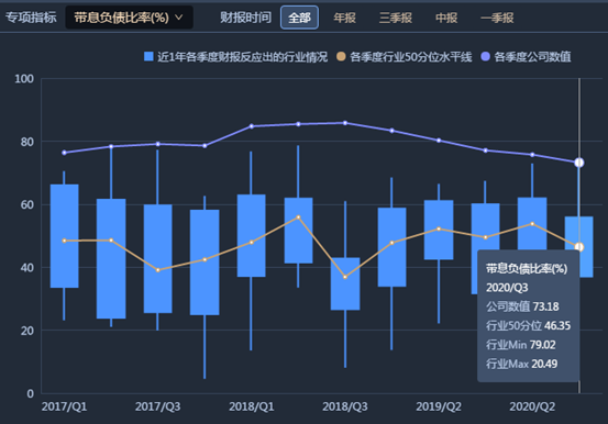 據(jù)年報(bào),2020年第三季,公司合并報(bào)表資產(chǎn)負(fù)債率為70.05%。報(bào)告中稱,報(bào)告期內(nèi),公司資產(chǎn)負(fù)債率較高,負(fù)債規(guī)模較大。雖然較高的杠桿率加快了公司的業(yè)務(wù)發(fā)展速度,但如果公司流動(dòng)性管理與負(fù)債情況不匹配,則在市場(chǎng)環(huán)境發(fā)生不利變化的情況下,公司面臨的財(cái)務(wù)風(fēng)險(xiǎn)隨之提高。如下圖,紫光集團(tuán)的歷年帶息負(fù)債比率遠(yuǎn)高于同行。另外,三季報(bào)中,公司帶息債務(wù)總額占公司總負(fù)債的73.18%。報(bào)告中稱,公司有息負(fù)債在報(bào)告期內(nèi)有所回落,但規(guī)模仍較大,在總負(fù)債中占比較高。未來公司償債壓力較大,需要大量流動(dòng)資金償還有息債務(wù)本息,如果公司經(jīng)營(yíng)狀況出現(xiàn)下滑或者融資渠道減少的情況,可能導(dǎo)致債券償付受到不利影響。如下圖,紫光集團(tuán)的歷年帶息負(fù)債比率遠(yuǎn)高于同行。