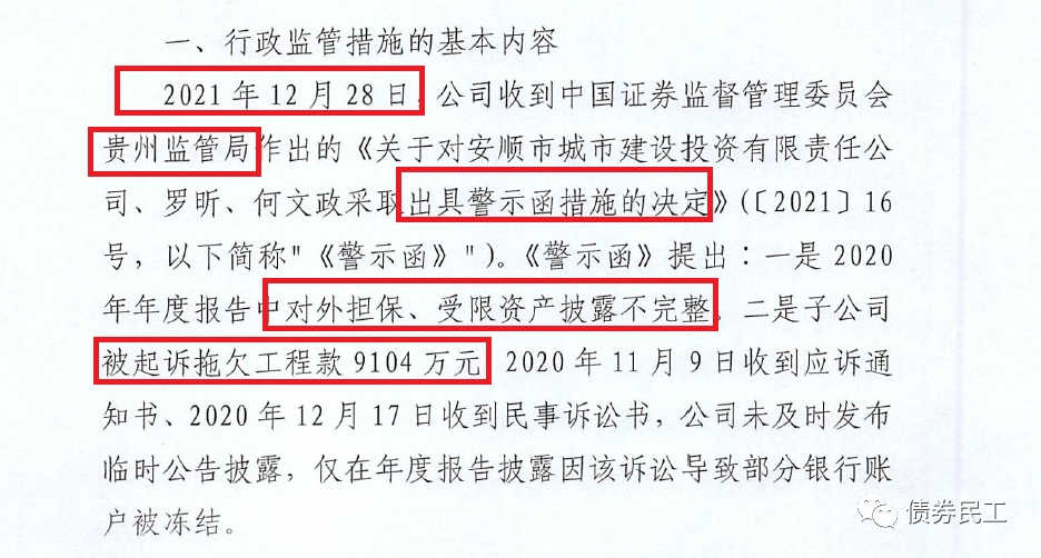 安順市城市建設投資有限責任公司發布(以下簡稱“安順城投”)于2022年1月13日披露公告,因2020年年度報告中對外擔保和受限資產披露不完整及重大訴訟未披露臨時公告等原因,被貴州證監局采取出具警示函措施。
