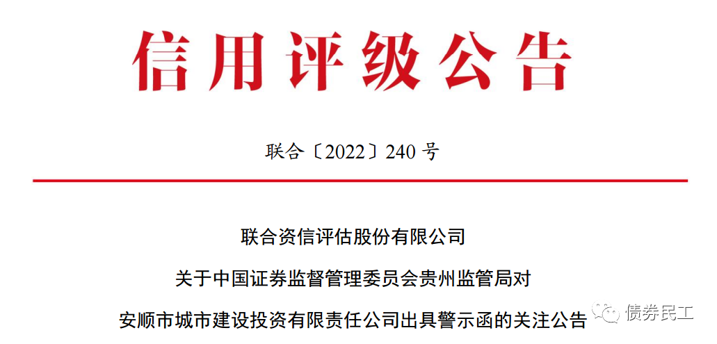 聯合資信評估有限公司已于2022年1月12日披露了對貴州證監局對安順城建出具警示函的關注公告。