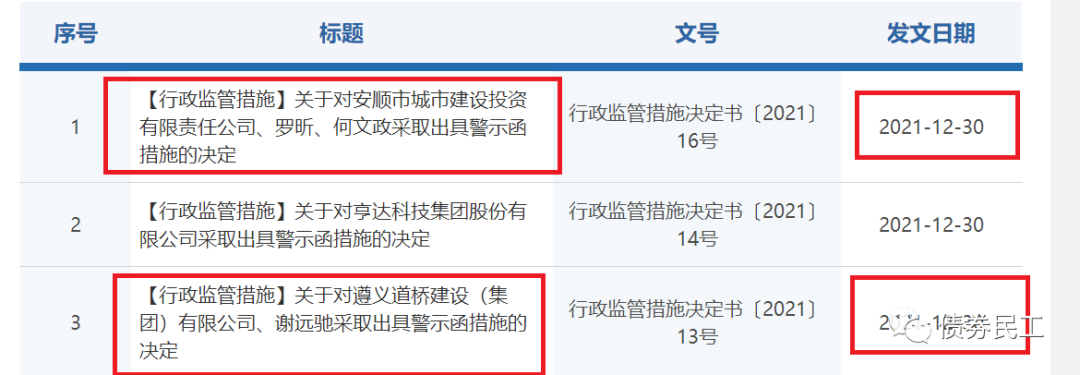 從兩家城投公司公開披露的信息來看,遵義道橋和安順城投公司收到貴州證監局警示函措施決定的日期是一樣的。債券民工查詢了一下貴州證監局的官網,遵義道橋和安順城投公司兩家城投公司被采取措施的發文日期均是2021年12月30日,落款日期分別為12月24日和12月27日。