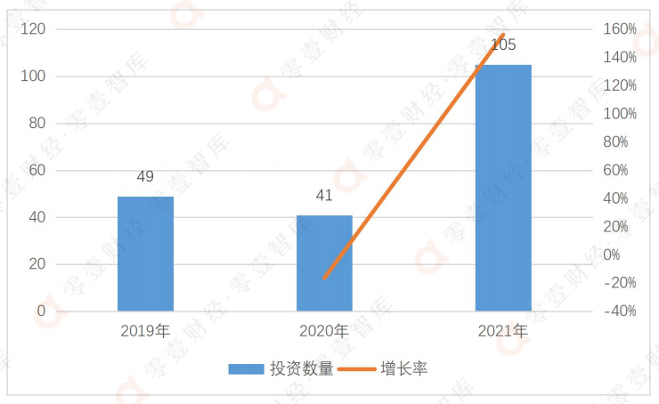 騰訊投資的投資領域涉及廣泛,投資企業也多為行業科技巨頭,文娛傳媒就包括了B站、快手等多家公司;在消費零售板塊,騰訊也涉及了美團、京東、拼多多等互聯網巨頭。騰訊投資在各領域都較為注重數字化以及信息化的投入,據零壹智庫不完全統計,近三年間(2019至2021年)騰訊投資投向數字科技企業的投資事件為195起,2019年和2020年數量相當,而在2021年其投資事件大幅上漲156%,至105件。