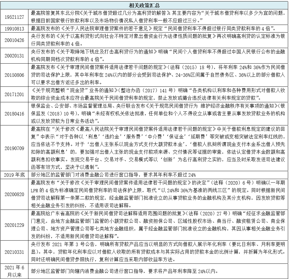 2021年6月以來,部分地區(qū)窗口指導(dǎo)轄內(nèi)消費(fèi)金融公司設(shè)定24%紅線,要求其個人貸款利率全面控制在24%(主要指單利的IRR、而非APR)以內(nèi),并設(shè)置一定過渡期。考慮到過去對貸款利率上限的控制主要集中于民間借貸、現(xiàn)金貸等領(lǐng)域,對持牌金融機(jī)構(gòu)貸款利率上限控制基本是首次,這可能意味著消費(fèi)金融行業(yè)已迎來變局。