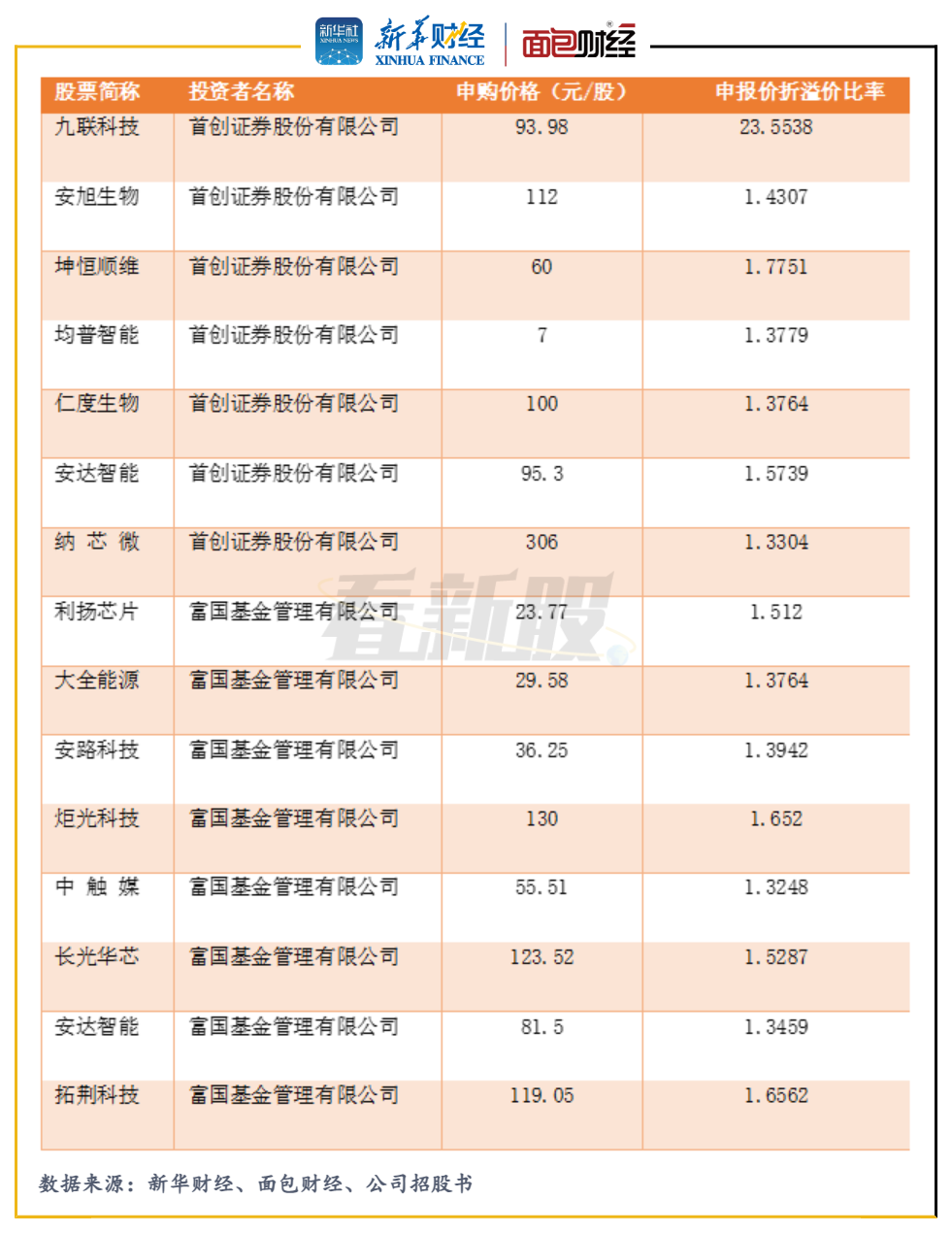 其中,首創(chuàng)證券和富國基金分別對7個和8個科創(chuàng)板新股報出明顯高價,高出其最終發(fā)行價超三成。