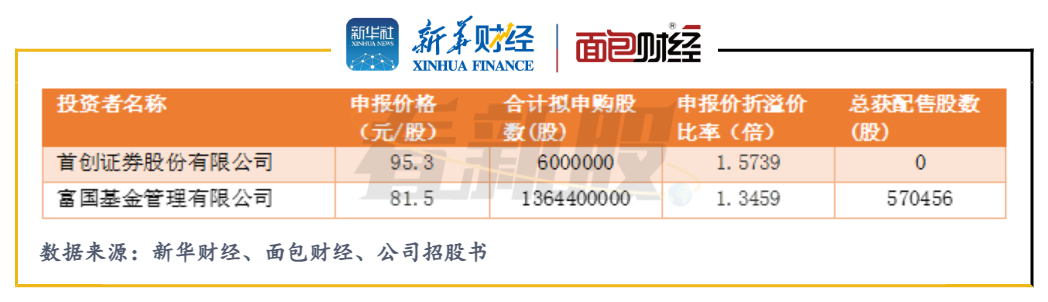 首創(chuàng)證券和富國基金2家投資機(jī)構(gòu)報價大于等于81.5元/股,明顯較高。其中首創(chuàng)證券報出95.3元/股的價格,被直接歸為“無效高價”。高報價雖被剔除,但仍會對最終發(fā)行價產(chǎn)生一定影響。