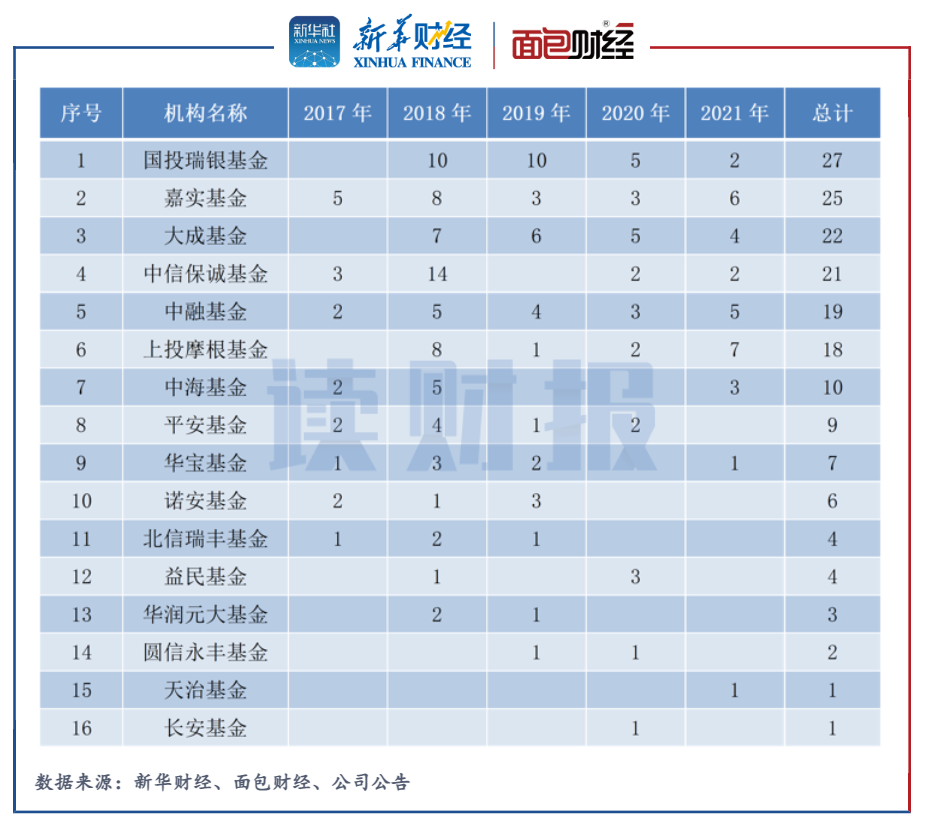 將時間跨度延伸至2017-2021年,22家信托系基金公司中4家機構累計清盤基金數量超過20只。其中,國投瑞銀清盤27只基金,位列行業第一,隨后為嘉實基金、大成基金,各清算25只、22只基金。