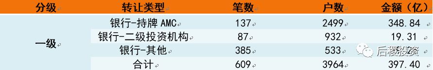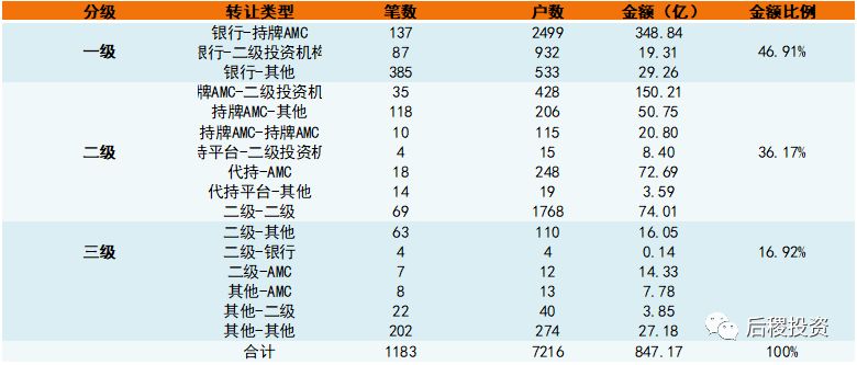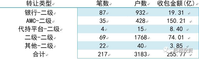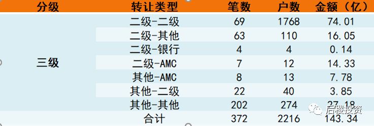注:我們以行業內慣例將不良資產行業上中下游市場分成三級。銀行端出包為一級市場;持牌機構出包、收包為二級市場;剩下為三級市場,另外一些小眾的轉讓交易為方便統計也歸為第三級市場。同時,我們把成交3筆及以上或單筆債權成交10戶及以上的機構劃為二級投資機構,成交3筆以下或單筆債權成交10戶以下為其它。