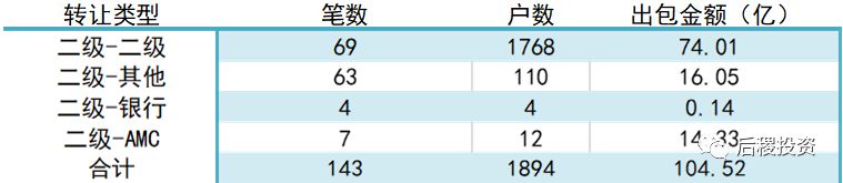 根據已有數據顯示,三級市場共出包約141億,二級投資機構出包占三級市場近74%,其他散戶占三級市場約26%。成交規模最大的為二級投資機構之間的出讓,成交金額占比在三級市場中占52.4%,二級投資機構之間的出包與收包為三級市場的主力軍。