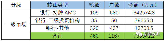 根據已有數據顯示,一級市場總成交戶數1167戶,總成交金額約73億余元,成交規模最大的是銀行-持牌AMC,成交金額在一級市場中占87.3%。對比18年數據,一級市場債權出讓總金額減少約4億元,其中銀行-持牌AMC出讓金額減少約10億元,銀行-二級投資機構出讓金額增加約7億元。