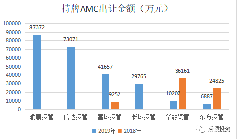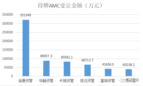 從上圖看,渝康資管表現亮眼,受讓金額遙遙領先,其余5家持牌AMC受讓規模相差不大。
