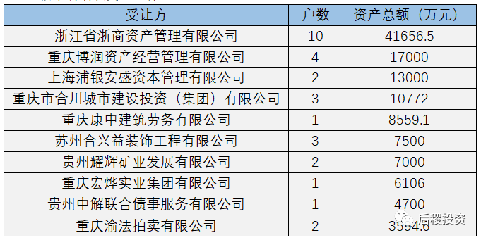 轉讓機構中,上述10家轉讓機構出讓總金額近8億元,在三級出讓市場中占38%;受讓機構中,上述10家受讓機構受讓總金額近6億元,在三級受讓市場中占18.3%。相對其他省份而言,在重慶不良資產三級市場上,多次見到小額貸款公司的身影,該特征與重慶當地政策息息相關。