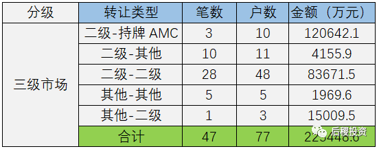 三級市場共出讓22億余元,二級投資機構類總出讓金額占三級市場92%左右,其他類占三級市場約8%。成交規模最大的為二級投資機構-持牌AMC,成交金額在三級市場中占比53.5%。相較18年,三級市場轉讓金額增加約12億元,其中二級-持牌AMC轉讓金額增加約6億元,二級-二級轉讓金額增加約6億元。
