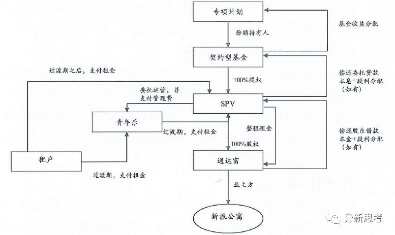 在搭建該類REITS結構前的既有結構中,青年樂為新派公寓的整租方和運營方,即青年樂與通達富簽署《整租協議》,并定期向通達富支付租金,青年樂再將新派公寓轉租給租客,賺取租金差價;在該交易結構中,由SPV、通達富、青年樂簽署三方《委托管理協議》,期限5年,約定SPV承接青年樂的職能,從通達富整租新派CBD物業并對外分租,原青年樂和通達富的總租關系終止。SPV委派青年樂提供租賃運營管理服務,包括但不限于確定金水平、催收、日常管理物業改造等安排,青年樂業績激勵費占當年SPV的分租租金和綜合配套收入之和的【5】%,且青年樂承諾從2018年起,SPV每年可分配凈現金流不低于【800】萬/年(扣除青年樂的業績激勵費之后);若SPV的可分配凈現金流不足上述標準的,青年樂承諾無條件不可撤銷地予以差額補足。