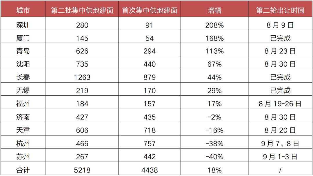 從供應規(guī)模來看,已發(fā)布供地公告的11城涉宅地塊總供應建面達5218萬平方米,整體較首輪供應總建面增加了18%,供應規(guī)模明顯增加,其中有7個城市供地規(guī)模明顯上漲。