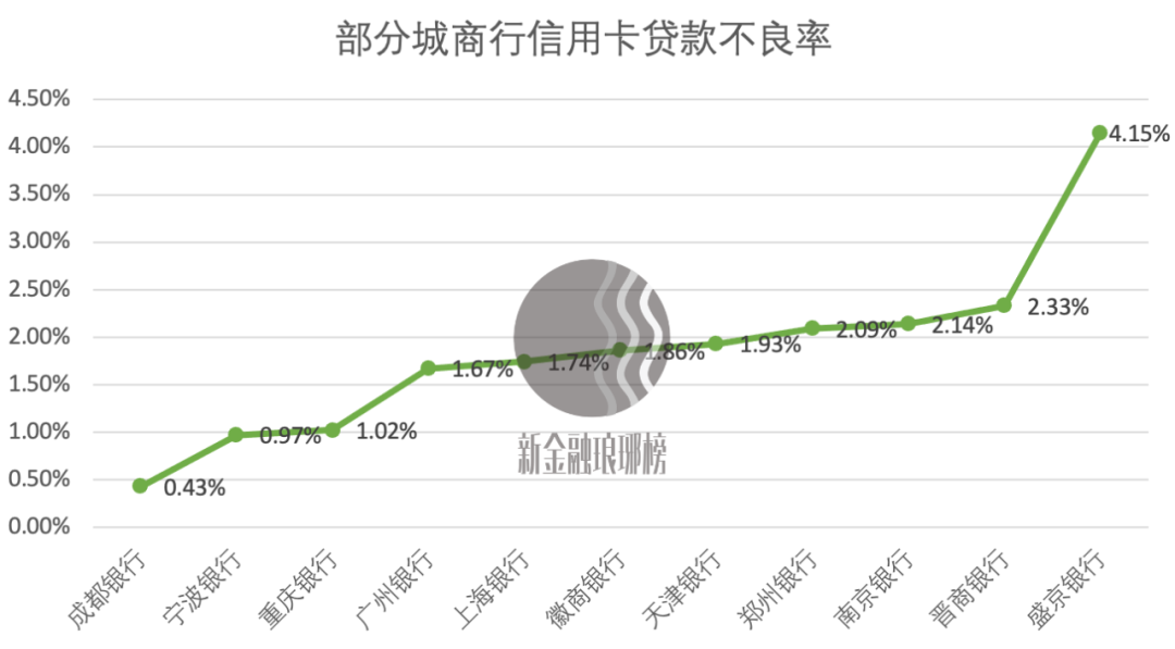 從信用卡資產(chǎn)質(zhì)量來看,頭部城商行整體表現(xiàn)良好。至去年末,成都銀行、寧波銀行與重慶銀行表現(xiàn)最佳,其信用卡貸款不良率分別為0.43%、0.97%、1.02%。
