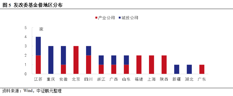從地區(qū)分布看,目前有14個省份參與發(fā)行了發(fā)改委基金債,其中,江蘇省4家,數(shù)量最多,其次是重慶、安徽、四川和北京,分布有3家。從區(qū)域內(nèi)公司屬性看,重慶、安徽的城投占比較高。