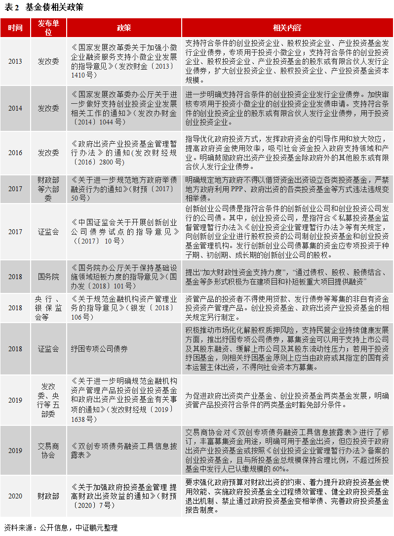 基金債發(fā)展歷程:通過債權(quán)融資設(shè)立或擴大基金融資,首次出現(xiàn)在2005年發(fā)改委、科技部等聯(lián)合頒布的《創(chuàng)業(yè)投資企業(yè)管理暫行辦法》。2013年發(fā)改委為支持小微企業(yè)發(fā)展,明確鼓勵創(chuàng)業(yè)投資企業(yè)、股權(quán)投資企業(yè)、產(chǎn)業(yè)投資基金發(fā)行企業(yè)債直接或間接投資于小微企業(yè)。2016年發(fā)改委發(fā)布《政府出資產(chǎn)業(yè)投資基金管理暫行辦法》,明確鼓勵政府出資產(chǎn)業(yè)投資基金除政府外的其他股東或有限合伙人發(fā)行企業(yè)債券。2016-2017年股權(quán)投資市場出現(xiàn)快速發(fā)展。2018年資管新規(guī)出臺后,普通私募基金的債券融資渠道關(guān)閉,股權(quán)投資市場規(guī)模開始下降。2019年央行等五部門發(fā)布的《關(guān)于進一步明確規(guī)范金融機構(gòu)資產(chǎn)管理產(chǎn)品投資創(chuàng)業(yè)投資基金和政府出資產(chǎn)業(yè)投資基金有關(guān)事項的通知》明確,符合一定條件的創(chuàng)業(yè)投資基金、政府出資產(chǎn)業(yè)投資基金,可以部分豁免資管新規(guī)?;饌l(fā)行受政策鼓勵出現(xiàn)增長。2020年財政部發(fā)布《關(guān)于加強政府投資基金管理 提高財政出資效益的通知》,進一步規(guī)范政府投資基金,要求強化政府預(yù)算對財政出資的約束、著力提升政府投資基金使用效能、實施政府投資基金全過程績效管理等。