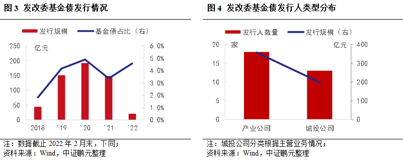 2018年后基金債發(fā)行規(guī)模出現(xiàn)快速上升,2020年達(dá)到191.90億元,隨后出現(xiàn)下降。整體看,2018年-2022年2月,共發(fā)行基金債47只,發(fā)行規(guī)模555.10億元,涉及31家發(fā)行人?;饌谄髽I(yè)債的占比較低,2020年為4.9%。2022年經(jīng)濟下行壓力加大,企業(yè)再融資難度上升,基金債發(fā)行占比提升至4.6%。