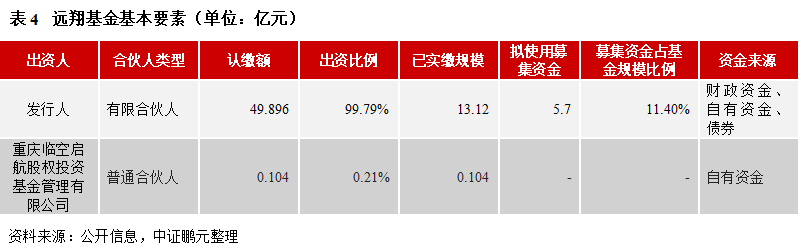 遠(yuǎn)翔基金,2016年9月由發(fā)行人發(fā)起設(shè)立并擔(dān)任有限合伙人,2021年變更基金規(guī)模至50億元,期限至2030年,發(fā)行人認(rèn)繳49.896億元,截至本期債券發(fā)行已實繳13.12億元,占比26.29%,其中,10.6億元為渝北區(qū)財政局資金,占基金總額的21.2%。重慶臨空啟航股權(quán)投資基金管理有限公司為普通合伙人兼基金管理人,為發(fā)行人控股子公司,持股比例98%。遠(yuǎn)翔基金主要投資戰(zhàn)略新興產(chǎn)業(yè)、現(xiàn)代服務(wù)業(yè)、文化創(chuàng)意產(chǎn)業(yè)等領(lǐng)域的擬投資標(biāo)的。