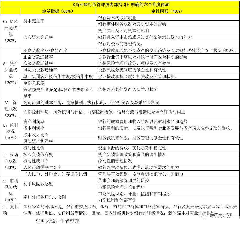 4、監(jiān)管評級要素由定量和定性兩類評級指標(biāo)組成。不過《商業(yè)銀行監(jiān)管評級辦法》并沒有披露九個維度的具體評判要素構(gòu)成,但這里可以參照《商業(yè)銀行監(jiān)管評級內(nèi)部指引》的規(guī)定。