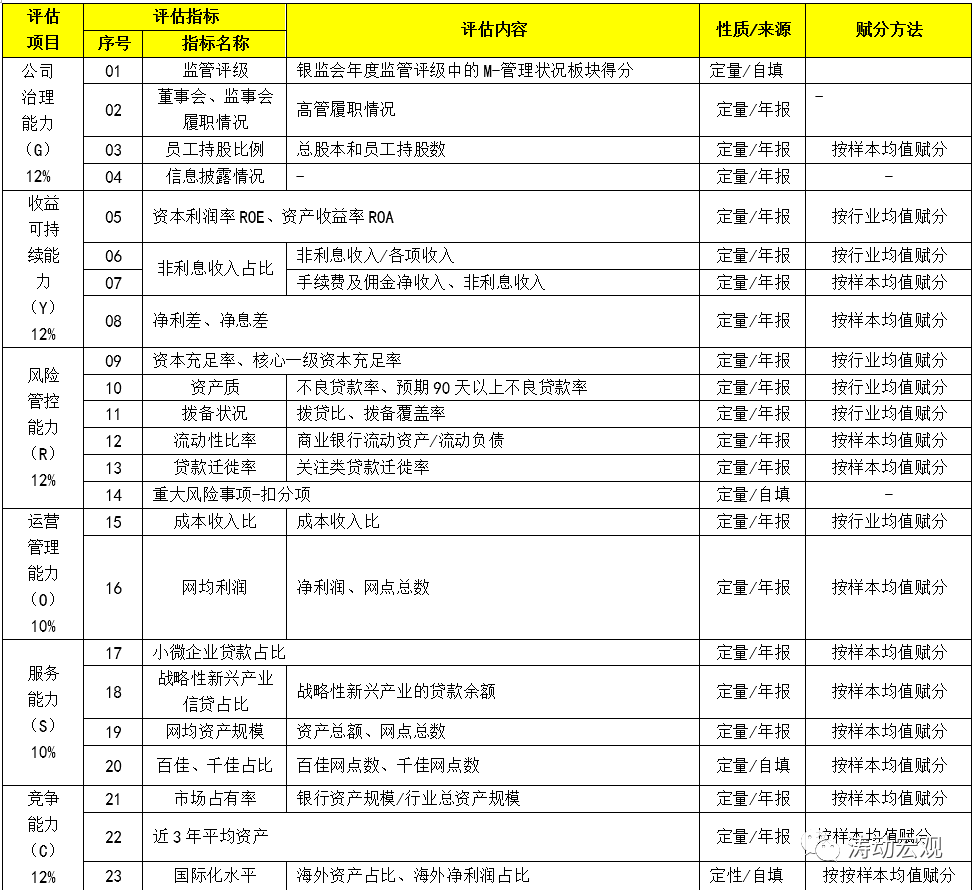 中國銀行業(yè)協(xié)會2013年成立課題組進行研究,并于2015年正式推出“陀螺”(GYROSCOPE)評價體系,從公司治理能力(Governance)、收益可持續(xù)能力(Yieldsustainability)、風(fēng)險管控能力(Riskcontrol)、運營管理能力(Operationalmanagement)、服務(wù)能力(Service quality)、競爭能力(Competitiveness)、體系智能化能力(Organizationalintellectualization)、員工知會能力(Personnelcompetence)、股本補充能力(Equityfunding)等九個維度32項指標(biāo)入手,同時在評價時將銀行分為全國性銀行、資產(chǎn)規(guī)模超過1500億元的地方性銀行和資產(chǎn)規(guī)模在1500億元以下的地方性銀行。