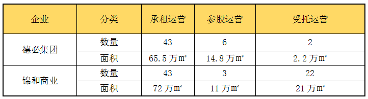 兩家公司的經(jīng)營模式主要包括“承租運營”、“參股運營”和“受托運營”三種模式。截至2021年上半年,德必集團三種模式下的經(jīng)營項目分別為43個、6個、2個,錦和商業(yè)分別為43個、3個、22個。