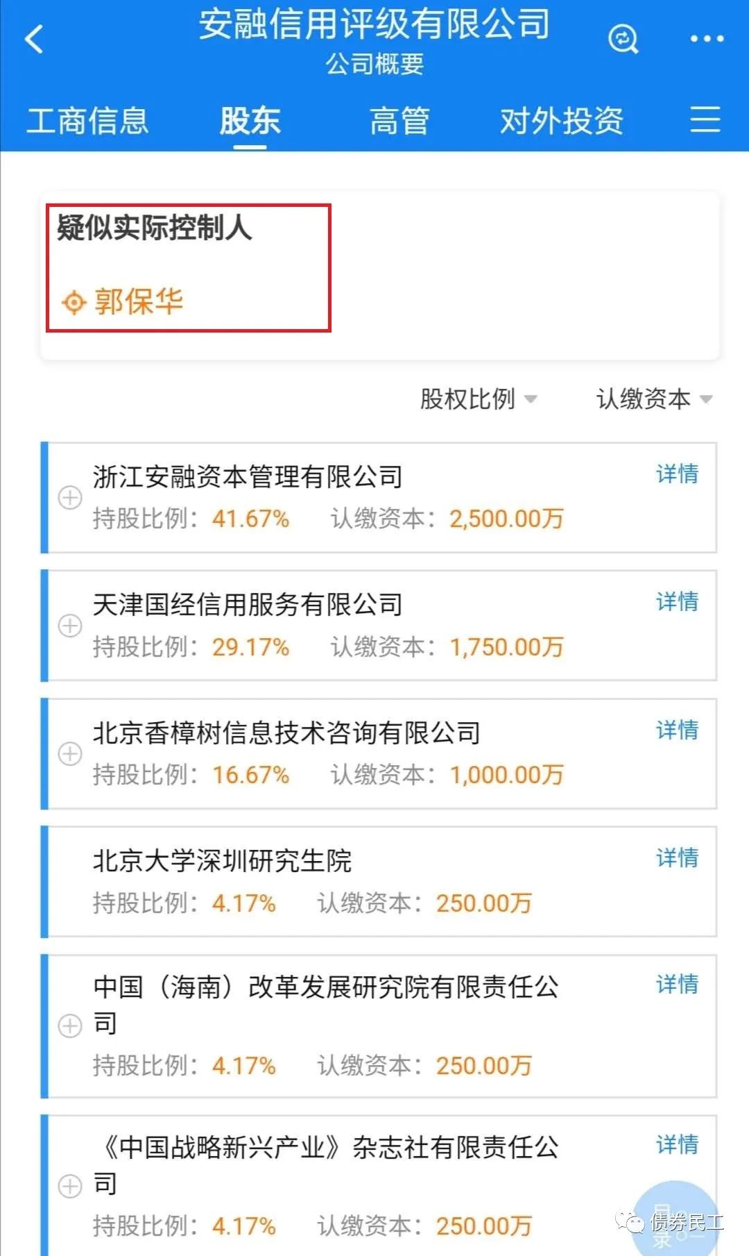 安融信評的股東為浙江安融資本管理有限公司、天津國經信用服務有限公司、北京香樟樹信息技術咨詢有限公司、《中國戰略新興產業》雜志社有限責任公司、北京大學深圳研究生院和中國(海南)改革發展研究院有限責任公司等6家法人單位,疑似實際控制人為自然人郭寶華。安融信評的股東結構的確是很引人注意,股東包括了北大、雜志社和研究院。