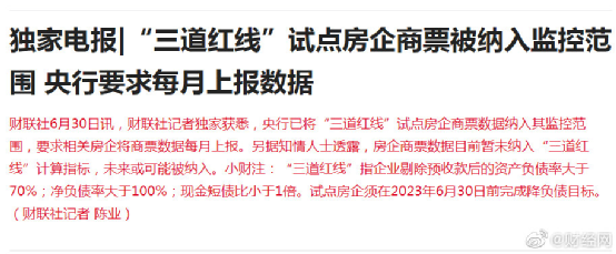 據財聯社6月30日消息,央行已將“三道紅線”試點房企商票數據納入其監控范圍,要求相關房企將商票數據每月上報。
