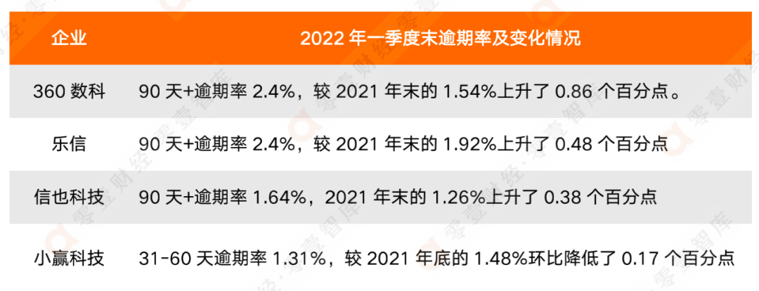 在資產(chǎn)質(zhì)量方面,360數(shù)科、樂信及信也科技的90天+逾期率延續(xù)了2021年四季度以來的上行勢頭,截至2022年一季度末分別為2.4%、2.4%及1.64%;小贏科技一季度末的31-60天逾期率為1.31%,環(huán)比降低了0.17個百分點。